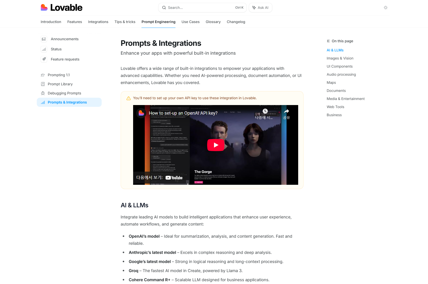 ์ด ๊ธ์ Lovable์ ๊ณต์ ๋ฌธ์์ธ Prompts & Integrations์ ๋ฒ์ญํ๊ณ ์ ๋ฆฌํ ์ฝํ ์ธ ์ ๋๋ค.