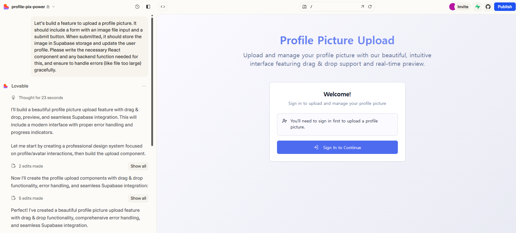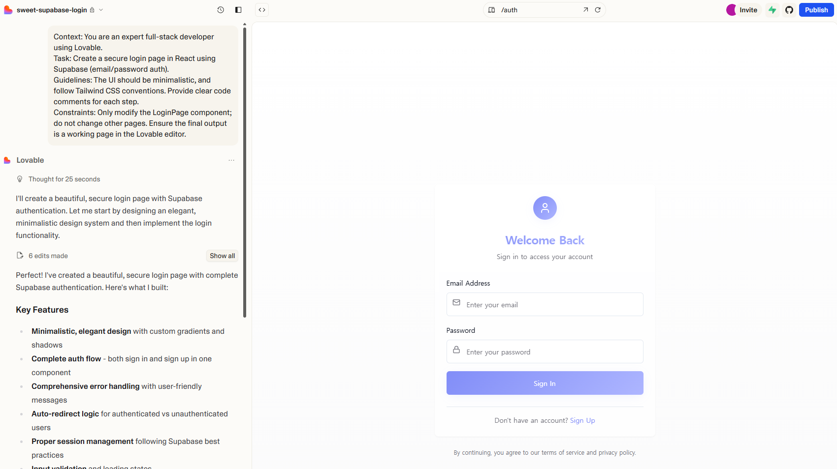 - Lovable(AI ๊ธฐ๋ฐ ์ฑ ๋น๋)์์ ํ๋กฌํํธ๋ UI ์์ฑ๋ถํฐ ๋ฐฑ์๋ ๋ก์ง ์์ฑ๊น์ง