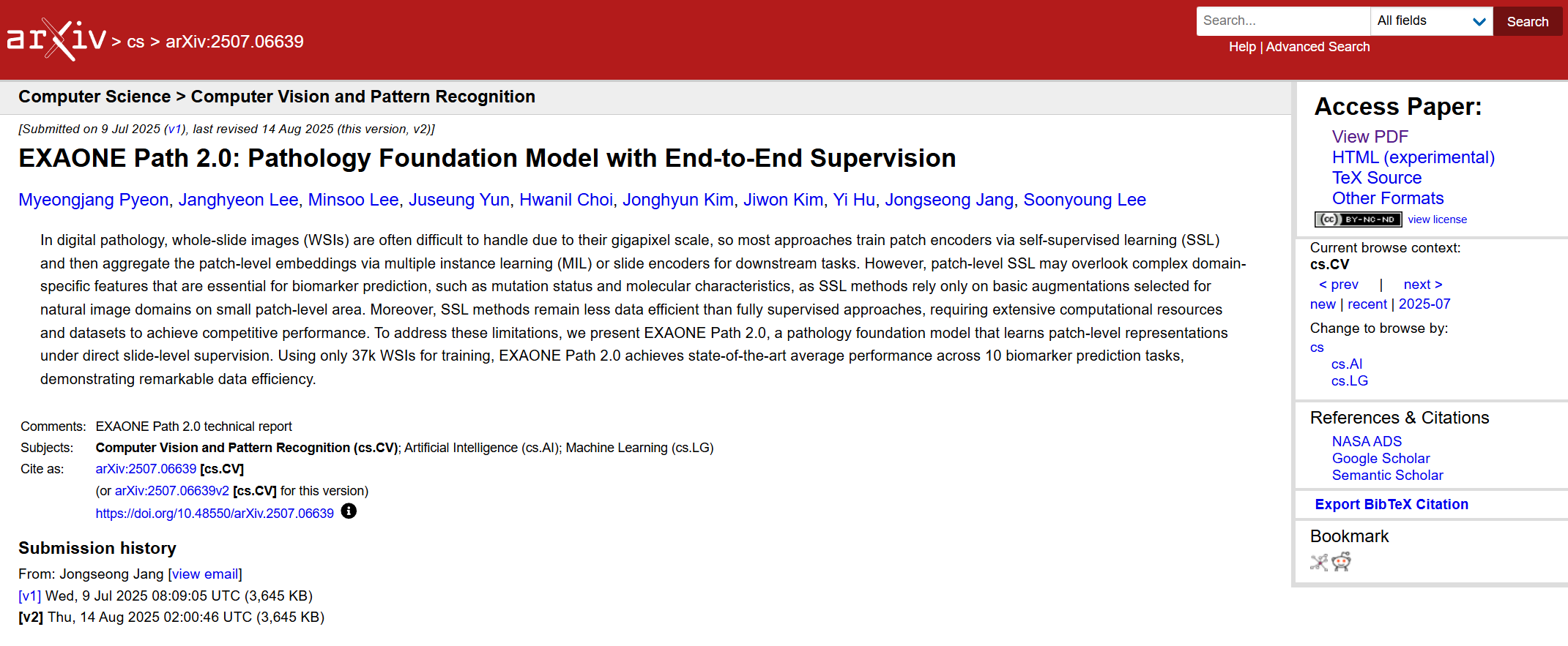 PYEON, Myeongjang, et al. EXAONE Path 2.0: Pathology Foundation Model with End-to-End Supervision. arXiv preprint arXiv:2507.06639, 2025.