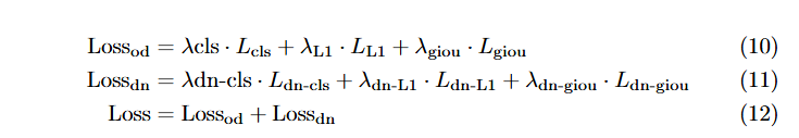 ํ๋ จ ๊ณผ์ ์ ๋ฐ์ ๊ฑธ์ณ DINO์ ์ผ์นํ๊ฒ ๋ชจ๋ธ ์๋ ด์ ๊ฐ์ํํ๊ณ ๋ชจ๋ธ ์ ๋ฐ๋๋ฅผ ํฅ์์ํค๊ธฐ ์ํด ์ฌ๋ฌ denoise group์ ์ฌ์ฉํฉ๋๋ค. ๋ค๋ฅธ detr-base ๋ชจ๋ธ๊ณผ ์ผ์นํ๊ฒ, ์ฌ๊ตฌ์ฑ ๋ฐ ์์ธก ๋จ๊ณ์์ detection ์์ ์ ์ฃผ์ loss function์ผ๋ก L1 loss์ GIOU loss๋ฅผ ์ฌ์ฉํฉ๋๋ค.