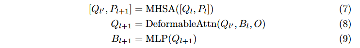 ๊ฐ decoder layer์์ ๋จผ์ query feature์ prompt feature๋ฅผ concatenateํ ํ ์ํธ์์ฉ์ ์ํ multi-head self-attention mechanism์ ์ ์ฉํฉ๋๋ค. ๊ทธ ๋ค์ query feature๋ deformable attention์ ํตํด ์๊ฐ์ ํน์ง์ attention์ ์ํํฉ๋๋ค.