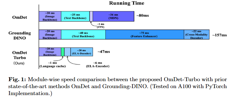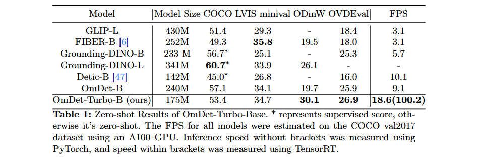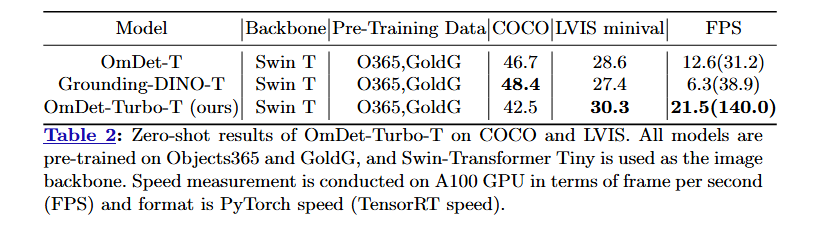 ์ฃผ๋ชฉํ ์ ์ OmDet-Turbo-Base๊ฐ TensorRT์ language cache ๊ธฐ๋ฒ์ ์ ์ฉํ์ฌ ์ด๋น 100.2 frame (FPS)๋ฅผ ๋ฌ์ฑํ๋ค๋ ๊ฒ์ ๋๋ค.