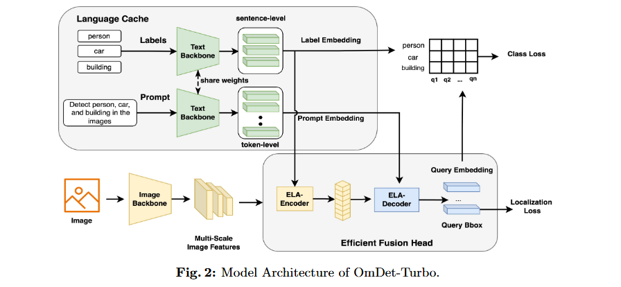 OmDet-Turbo๋ Text backbone TTT๋ prompt ppp์ K๊ฐ์ label L=[l1,โฆ,lK]L = [l_1, โฆ, l_K]L=[l1โ,โฆ,lKโ]์ ํ ์คํธ ์ ๋ ฅ์ ์ธ์ฝ๋ฉํ์ฌ label embedding๊ณผ prompt embedding์ ์์ฑํ๋ CLIP๊ณผ ๊ฐ์ transformer language model์ ๋๋ค.