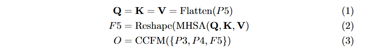 RT-DETR์์ ์๊ฐ๋ efficient hybrid encoder๋ฅผ ๋ฐ๋ผ, multi-scale image backbone feature์ ๋ง์ง๋ง ์ธต์ธ P5P5P5๋ multilayer Multi-head Self-Attention (MHSA) ๋ชจ๋์ ํตํด ์ธ์ฝ๋ฉ๋์ด F5F5F5๋ฅผ ์ป์ต๋๋ค.