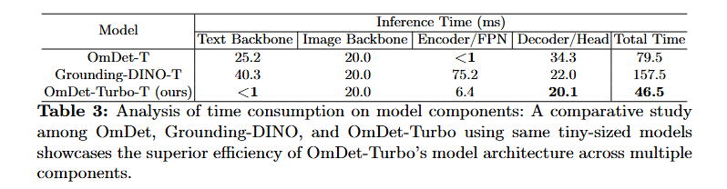 OmDet-Turbo๋ ๋ชจ๋ ๊ตฌ์ฑ์์์์ ๋ค๋ฅธ ๋ ๋ชจ๋ธ์ ์ผ๊ด๋๊ฒ ๋ฅ๊ฐํ๋ฉฐ, encoder/FPN๊ณผ decoder/head ์น์ ์์ ํนํ ์ฃผ๋ชฉํ ๋งํ ๊ฐ์ ์ ๋ณด์ ๋๋ค. Encoder/FPN ๊ตฌ์ฑ์์์์ Grounding-DINO๋ feature enhancer layer์ heavy multi-modality computation์ผ๋ก ์ธํด ์๋นํ ์๋ ์ ํ๋ฅผ ๊ฒช์ต๋๋ค.
