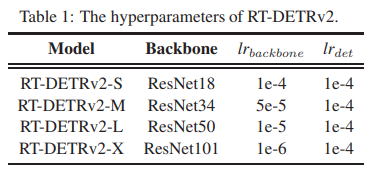 RT-DETR๊ณผ ๋ง์ฐฌ๊ฐ์ง๋ก ImageNet์์ ์ฌ์ ํ๋ จ๋ ResNet์ backbone์ผ๋ก ์ฌ์ฉํ๊ณ , batch size 16์ผ๋ก AdamW optimizer๋ฅผ ์ฌ์ฉํ์ฌ RT-DETRv2๋ฅผ ํ๋ จ์ํต๋๋ค.