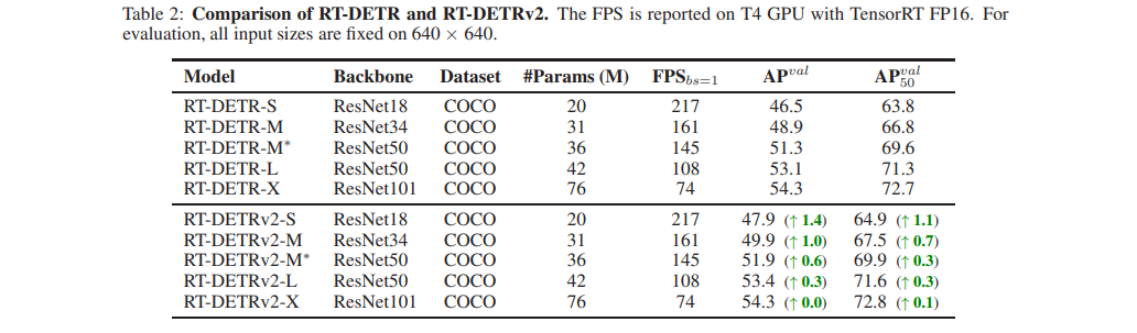 ํ 2: RT-DETR๊ณผ RT-DETRv2์ ๋น๊ต