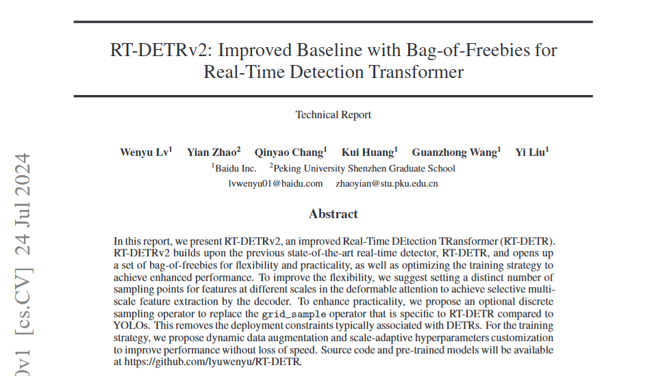 ์ด ๋ณด๊ณ ์์์๋ ๊ฐ์ ๋ ์ค์๊ฐ Detection Transformer์ธ RT-DETRv2๋ฅผ ์ ์ํฉ๋๋ค. RT-DETRv2๋ ๊ธฐ์กด์ ์ต์ ์ค์๊ฐ detector์ธ RT-DETR์ ๊ธฐ๋ฐ์ผ๋ก ๊ตฌ์ถ๋์์ผ๋ฉฐ, ์ ์ฐ์ฑ๊ณผ ์ค์ฉ์ฑ์ ์ํ bag-of-freebies