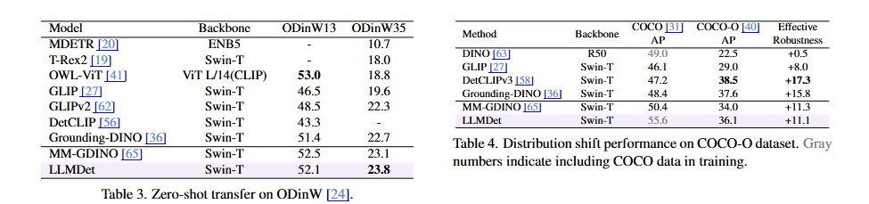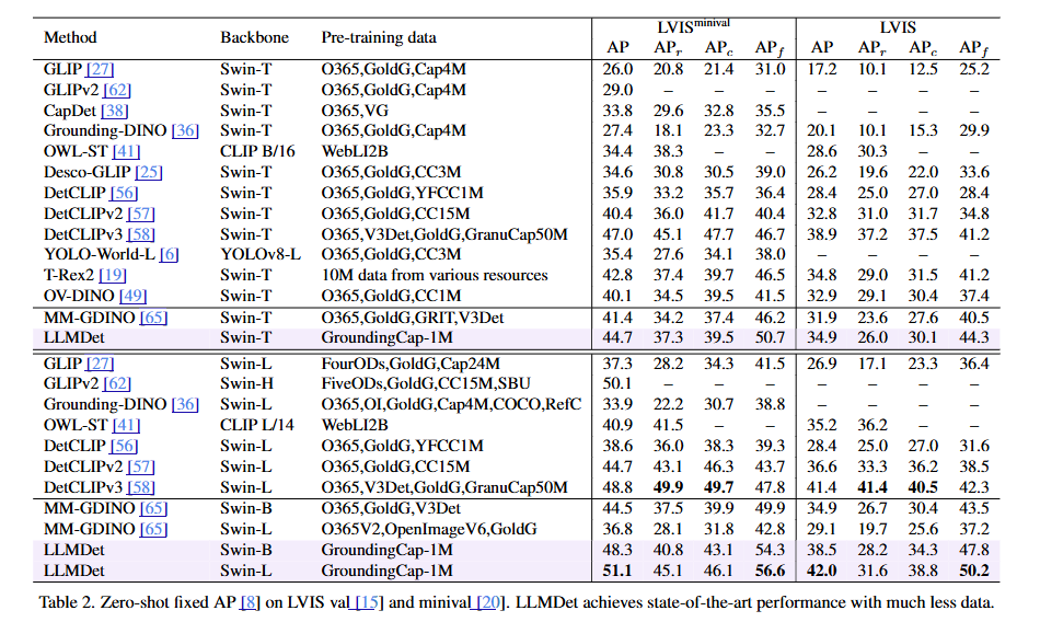 - ์๋ก์ด ํ๋ จ ๋ชฉํ์ ์๋ก์ด ๋ฐ์ดํฐ์ ์ผ๋ก LLMDet์ ๋ค์ํ backbone์์ LVIS minival์์ ๊ธฐ์ค์ MM-GDINO๋ฅผ 3.3%/3.8%/14.3% AP์ 3.1%/3.3%/17.0% APr๋ก ๋ฅ๊ฐํฉ๋๋ค.