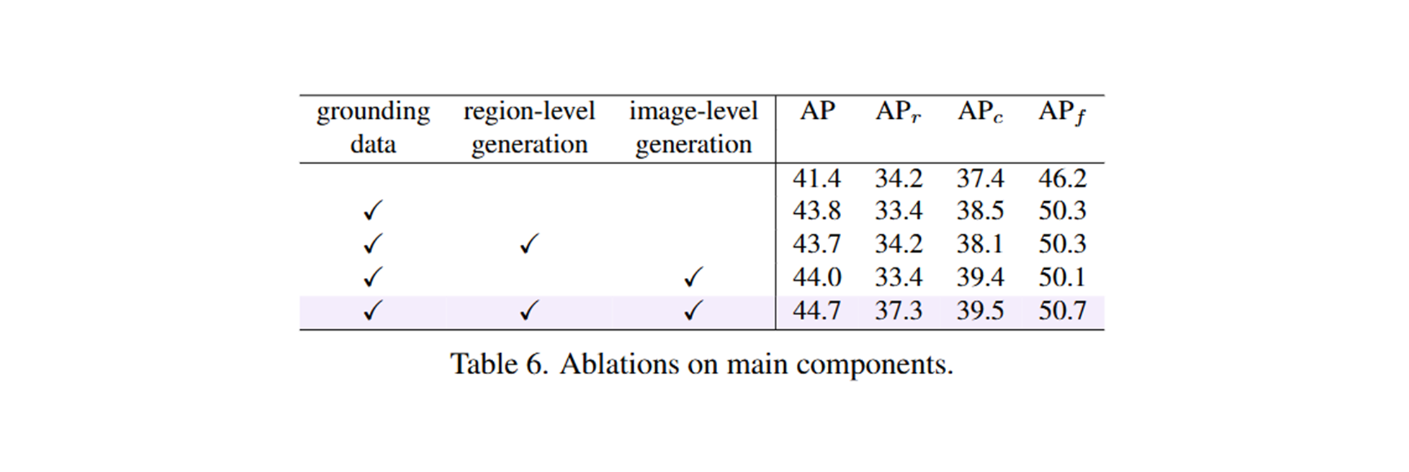 - Grounding annotation๋ง์ผ๋ก fine-tuningํ๋ฉด ์ฑ๋ฅ์ด 41.4% AP์์ 43.8% AP๋ก ํฅ์๋ฉ๋๋ค.