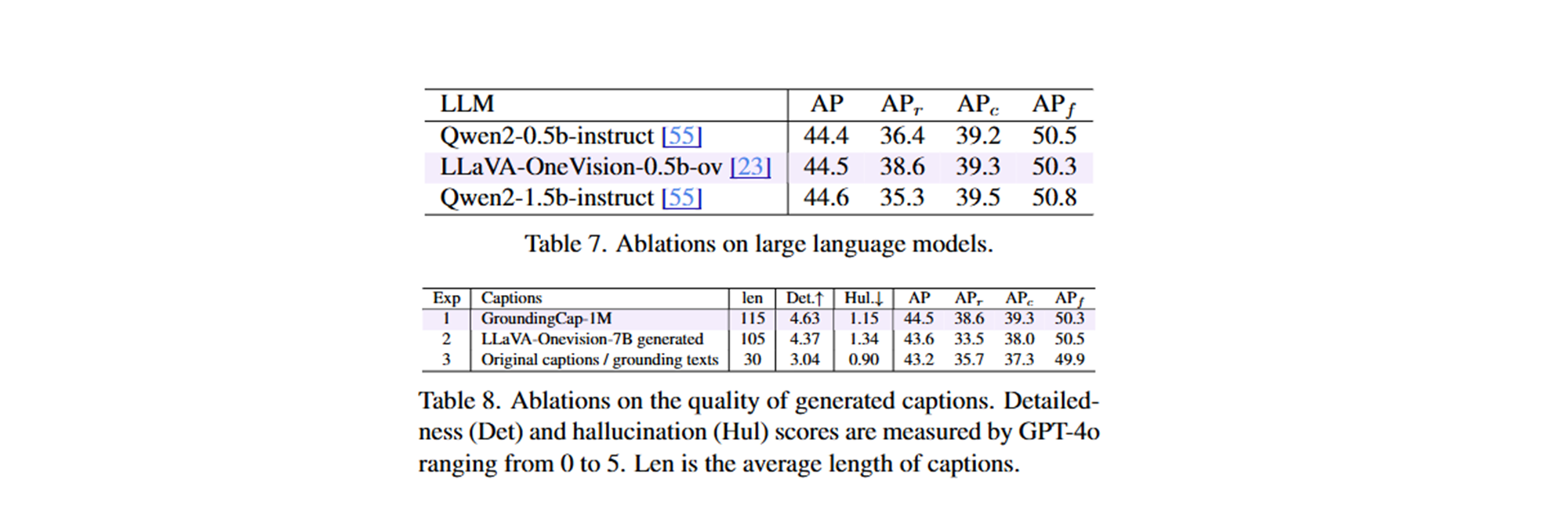 Large language model์ LLaVA-OneVision-0.5b-ov์์ ์ด๊ธฐํ๋ฉ๋๋ค. ๋ฉ๋ชจ๋ฆฌ์ ํ๋ จ ํจ์จ์ฑ์ ์ ์ฝํ๊ธฐ ์ํด image-level generation์ ์ต๋ token ๊ธธ์ด๋ฅผ 1600์ผ๋ก, region-level generation์ ๊ฒ์ 40์ผ๋ก ์ค์ ํฉ๋๋ค. ์ด๋ฏธ์ง๋น caption generation์ ์ํ ์ต๋ ์์ญ ์๋ 16์ผ๋ก ์ ํ๋ฉ๋๋ค.