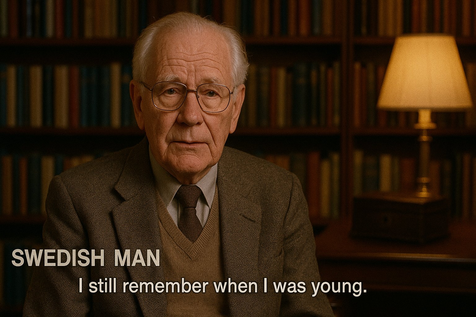 In a 90s documentary-style interview, an old Swedish man sits in a study