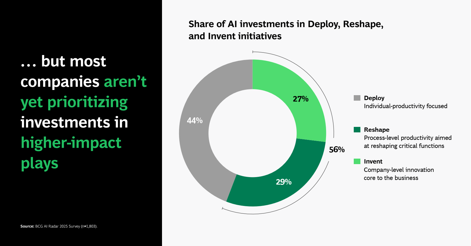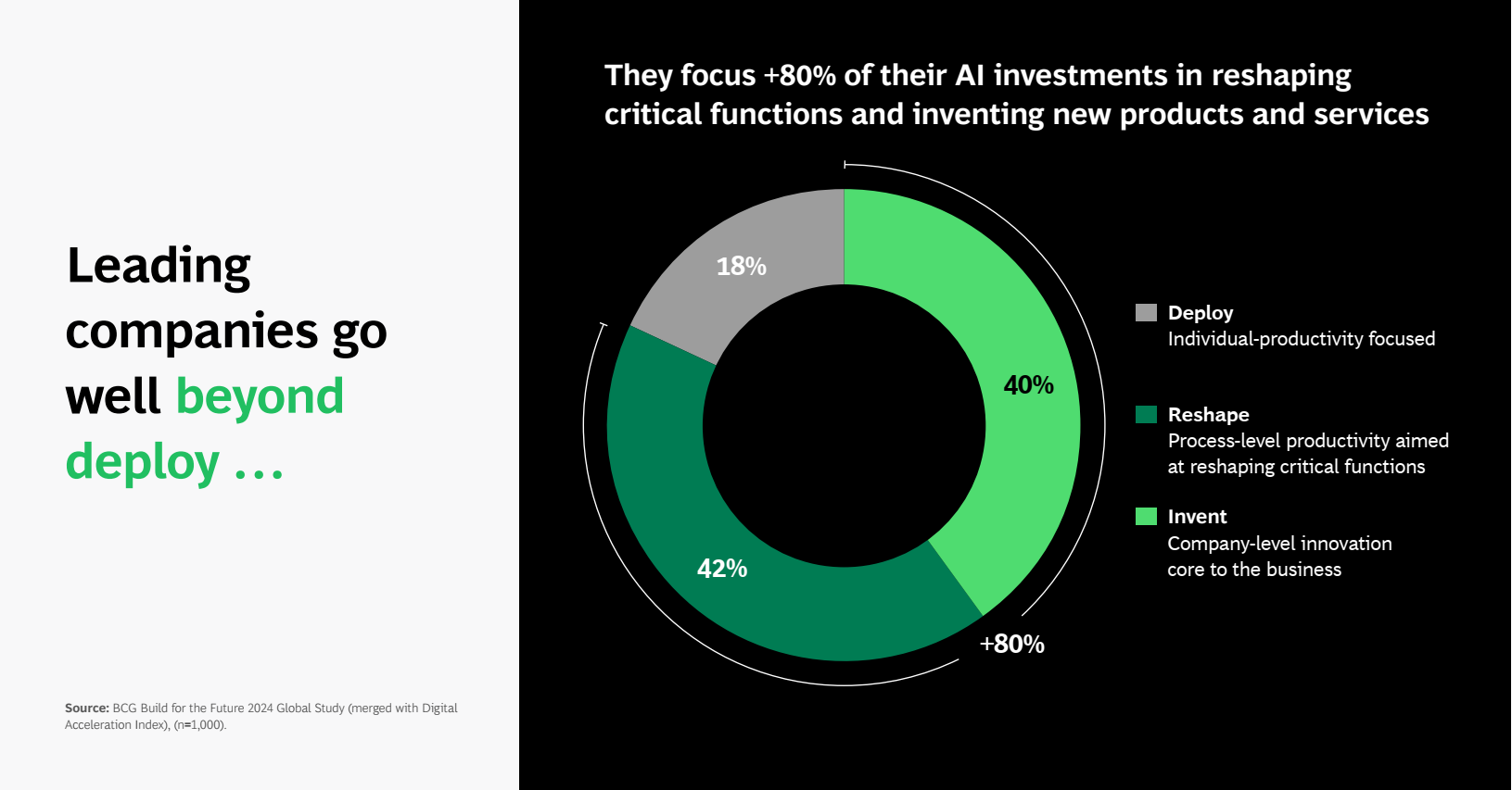 ์ ๋ ๊ธฐ์ ๋ค์ AI ํฌ์์ 80% ์ด์์ Reshape(42%)์ Invent(40%)์ ์ง์คํฉ๋๋ค. Deploy์๋ 18%๋ง ํฌ์ํฉ๋๋ค. (Go beyond Deployment)