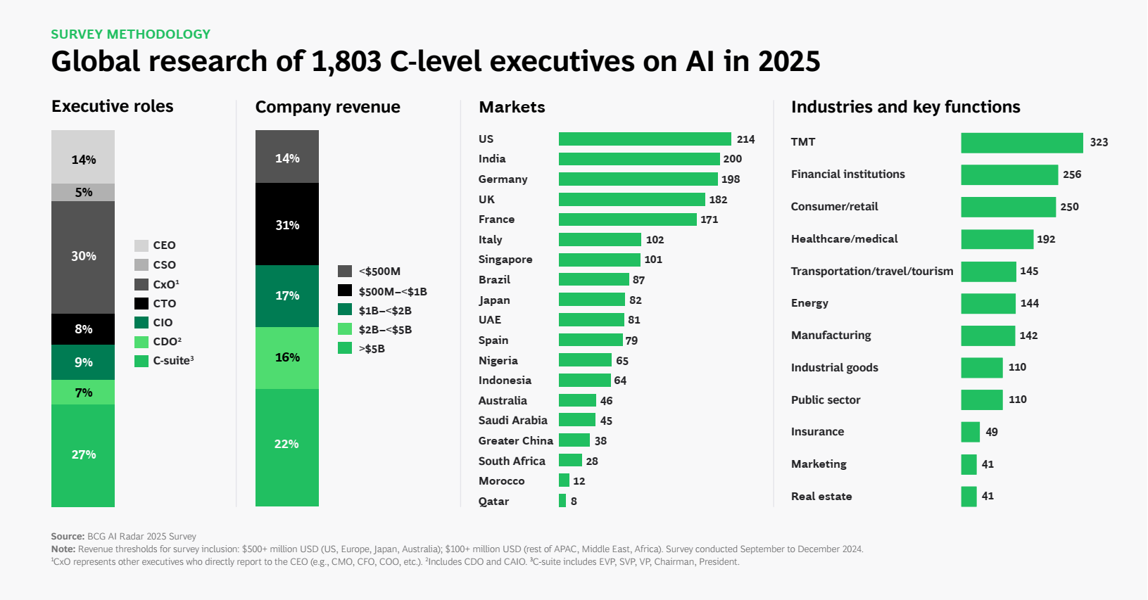 BCG(Boston Consulting Group)๊ฐ 2025๋ 1์ ๋ฐํํ AI Radar ๋ณด๊ณ ์๋ ์ ์ธ๊ณ 1,803๋ช ์ C-level ๊ฒฝ์์ง์ ๋์์ผ๋ก ํ ์ค๋ฌธ์กฐ์ฌ๋ฅผ ๊ธฐ๋ฐ์ผ๋ก ํฉ๋๋ค.