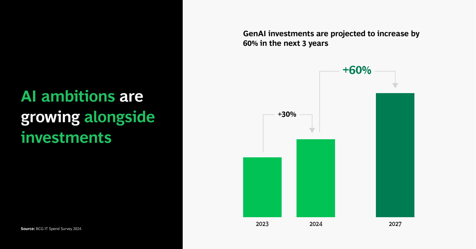 BCG IT Spend Survey 2024์ ๋ฐ๋ฅด๋ฉด, GenAI ํฌ์๋ 2023๋ ๋๋น 2024๋ ์ 30% ์ฆ๊ฐํ์ผ๋ฉฐ, 2027๋ ๊น์ง 60% ์ถ๊ฐ ์ฑ์ฅ์ด ์์๋ฉ๋๋ค. ์ด๋ฌํ ํฌ์ ์ฆ๊ฐ๋ AI์ ๋ํ ๊ธฐ์ ๋ค์ ๋์์ง ๊ธฐ๋๋ฅผ ๋ฐ์ํฉ๋๋ค.