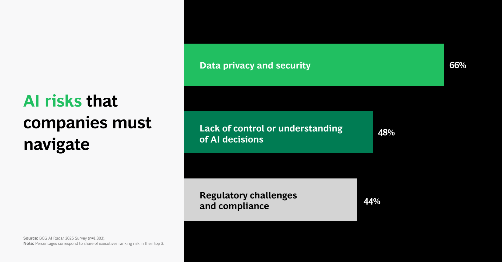 ๊ฒฝ์์ง๋ค์ด ์์ 3๋ ๋ฆฌ์คํฌ๋ก ๊ผฝ์ ํญ๋ชฉ์ ๋ณด๋ฉด, 66%๊ฐ ๋ฐ์ดํฐ ํ๋ผ์ด๋ฒ์ ๋ฐ ๋ณด์์, 48%๊ฐ AI ์์ฌ๊ฒฐ์ ์ ๋ํ ํต์ ๋ ฅ ๋๋ ์ดํด ๋ถ์กฑ์, 44%๊ฐ ๊ท์ ๊ณผ์ ๋ฐ ์ปดํ๋ผ์ด์ธ์ค๋ฅผ ์ ํํ์ต๋๋ค.