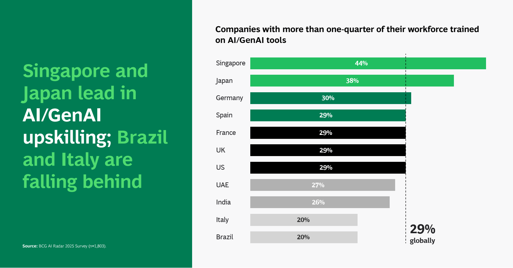 ์ธ๋ ฅ์ 25% ์ด์์ AI/GenAI ๋๊ตฌ๋ก ๊ต์กํ ๊ธฐ์ ๋น์จ์ ๋ณด๋ฉด, ์ฑ๊ฐํฌ๋ฅด๊ฐ 44%๋ก 1์, ์ผ๋ณธ์ด 38%๋ก 2์์ ๋๋ค. ๋ ์ผ, ์คํ์ธ, ํ๋์ค, ๋ฏธ๊ตญ, ์๊ตญ์ 29~30% ์์ค์ด๋ฉฐ, UAE 27%, ์ธ๋ 26%์ ๋๋ค. ์ดํ๋ฆฌ์์ ๋ธ๋ผ์ง์ 20%๋ก ๊ฐ์ฅ ๋ฎ์ ์์ค์ ๋๋ค.