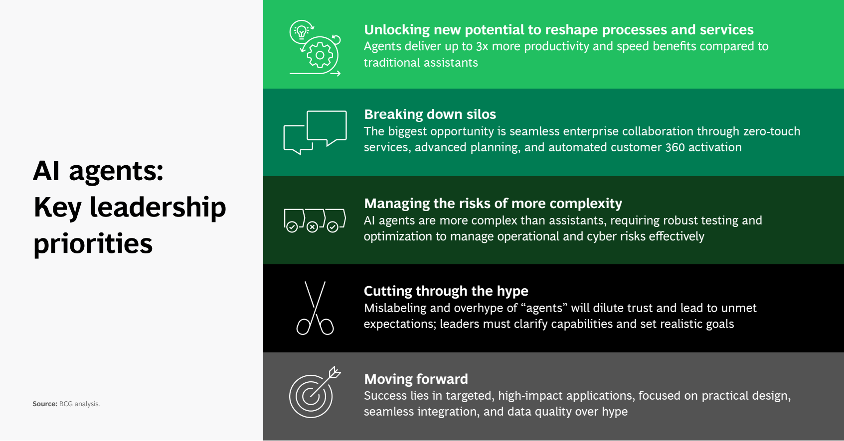 BCG ๋ถ์์ ๋ฐ๋ฅด๋ฉด, AI Agent ๋์ ์ฑ๊ณต์ ์ํด ๋ฆฌ๋์ญ์ด ์ง์คํด์ผ ํ ๋ค์ฏ ๊ฐ์ง ํต์ฌ ์ฐ์ ์์๊ฐ ์์ต๋๋ค. ๊ฐ ํญ๋ชฉ์ ์ฒด๊ณ์ ์ผ๋ก ์ดํด๋ณด๊ฒ ์ต๋๋ค.
